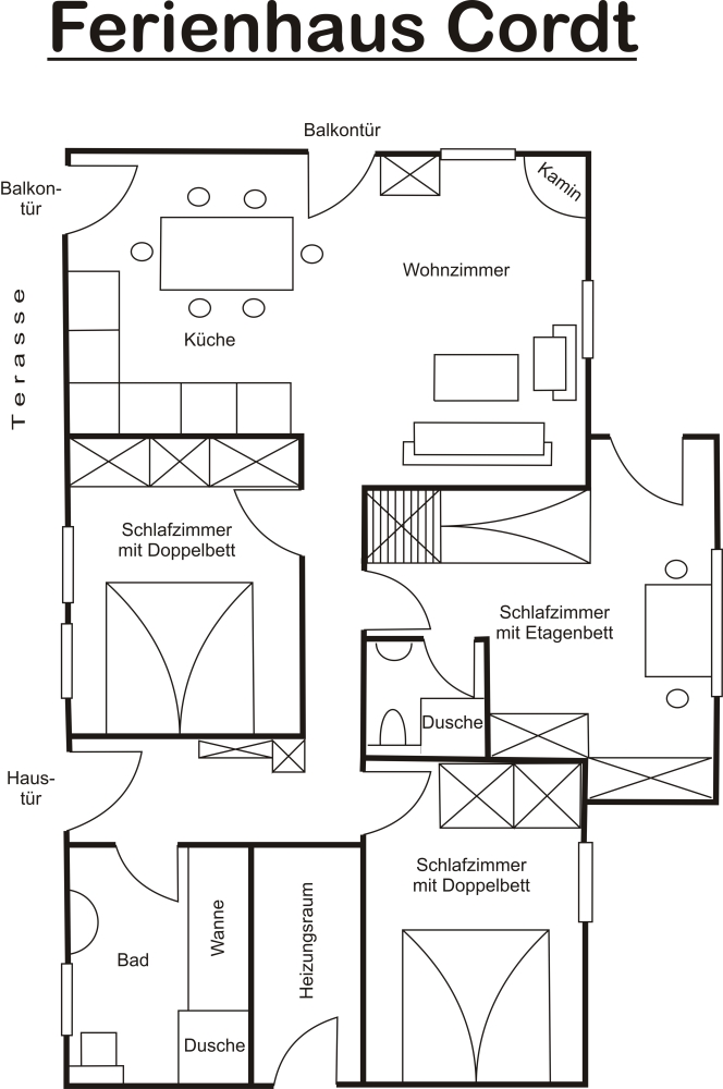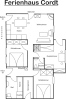 Das Ferienhaus bietet Platz für bis zu 6 Personen + 1 Baby, Küche und Wohnzimmer mit herrlicher Südwest Terrasse, 2 Schlafzimmer mit Doppelbett und 1 Schlafzimmer mit Etagenbett und seperaten Eingang und 2. Terasse, 2 Badezimmer auf insgesamt ca. 94m².